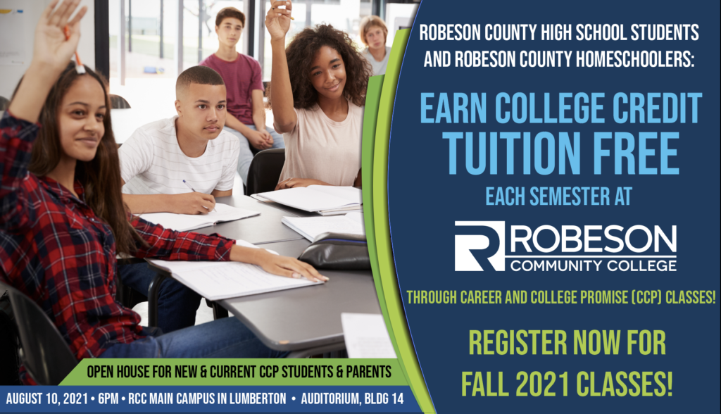 Robeson Community College invites all Robeson County high school students and their parents, including those who are homeschooled, to an open house on August 10, 2021 at 6:00 p.m. to learn more about the career and college promise program.