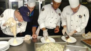 Students are required to have one pair of non-slip rubber-soled shoes and hair restraints. Rules of sanitation must be followed; therefore, short, clean fingernails are a must with no polish and/or artificial nails. The wearing of jewelry, except a plain wedding band, is also not authorized. Students are encouraged to bring in their own Knife kit that should include, but not be limited to, a Chef knife, boning knife, paring knife, and slicing knife. If there are any questions, please contact the instructor.