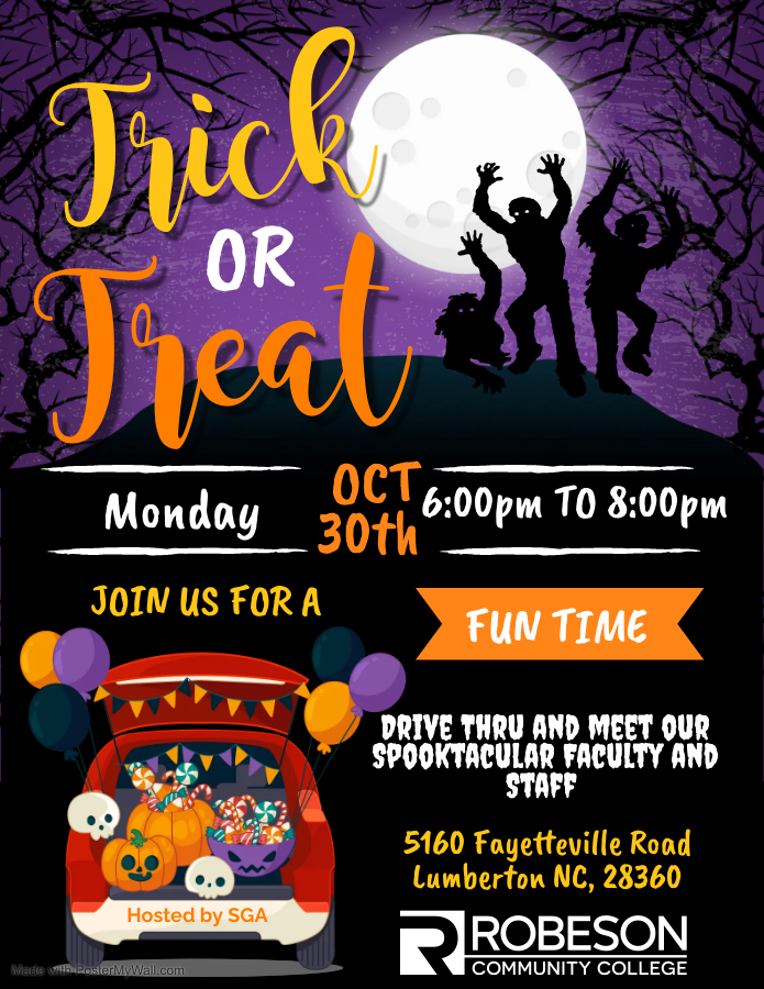 This year the RCC Student Government Association is going all out for its Annual Drive-Thru Trick or Treat Celebration, which will be held on Monday, October 30 from 6:00 p.m. to 8:00 p.m. at the main campus in Lumberton.